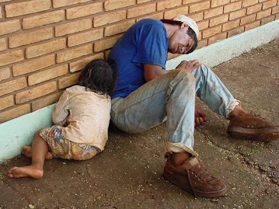 O filho tenta acordar o pai caído, totalmente alcolizado